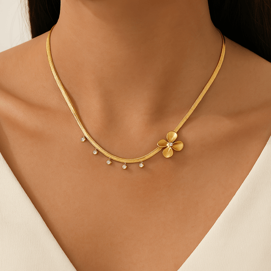 • 18kt Gold Plated Snake Chain Flower Cubic Zirconia Necklace - Manoune JEWELRY Belly_Jewelry Earrings - Navel_Ring - Necklace - Stud - Manoune_Jewelry - Belly_Ring - Navel_Jewelry Titanium Gold_Plated